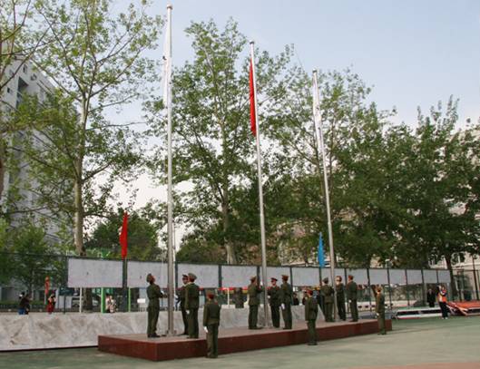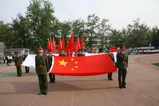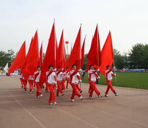 运动会开幕式上,校领导与来宾、运动员、教练员、裁判员及观众高声歌唱中华人民共和国国歌。