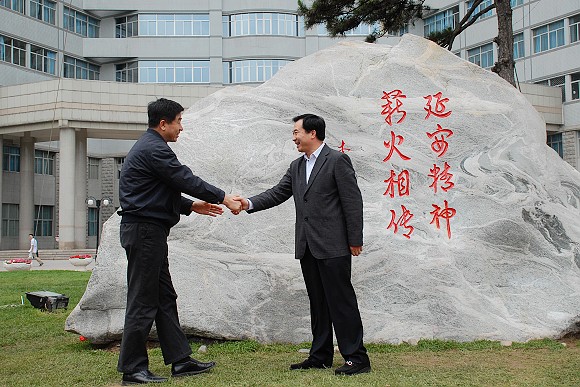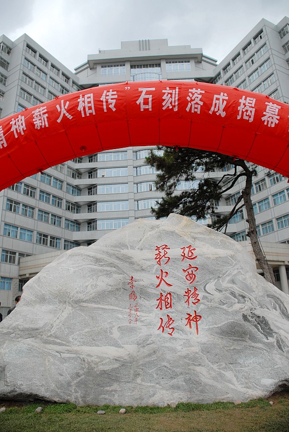 “延安精神 薪火相传”石刻由中共延安市委、延安市政府赠与北京理工大学(原延安自然科学院),并由原人大常委会委员长、国务院总理、我校校友李鹏亲笔题字。这块石刻的落成必将成为北京理工大学的校园重要景观和“延安精神”的传承载体。