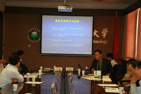 生命科学与技术学院药学系王建农教授,向与会的领导汇报了生命学院与北京理工亘元医药研发中心有限公司合作的傣医药研发项目的开展情况。介绍了傣医药发展的背景和应用现状,分析了特点与特色;汇报了将最新研发方法与传统医药结合的研究思路及项目进展情况。