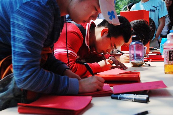 在募捐活动现场,每一个捐款的师生都会得到一张精美的卡片,他们可以在上面写上自己对都江堰聚源中学校同学的祝福和鼓励,将对灾区弟弟妹妹们的祝福信写在爱心卡片上,捎去来自北理学子远方的祝福。北京理工大学信息学院07级研究生王冬婷在卡片上写道“我们一直在支持着你们,给予你们力量,希望你们发扬不抛弃、不放弃的精神,只要我们万众一心、众志成城,任何困难都是可以战胜的!校园的重建,指日可待!” 这个举措,充分表达了大学生哥哥姐姐们对小弟弟小妹妹的热切关怀和深情慰问,给予他们精神上的力量。
