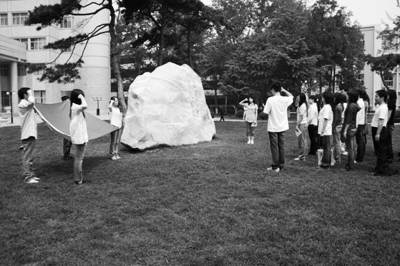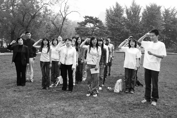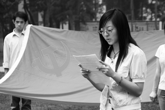 随后,在应龙同学的带领下,全体与会党员,面向党旗,面向“延安精神 薪火相传”的巨石,举起右手,庄严宣誓,坚定有力的声音回荡在北理的校园中。宣誓结束后,应龙同学代表我院全体07级研究生党员,发出倡议,希望全体北理学子,能够以延安精神共勉,向克服重重困难、与死亡和伤痛搏斗的灾区人民学习,向舍生忘死、战斗在抗震救灾前线的解放军官兵、武警官兵、公安干警、专业搜救队员和医护人员,以及无私奉献的志愿者们致敬。从身边做起,让我们以崇高的精神和实际的行动,在日常的学习、工作和生活中,用优异的成绩回报国家,回馈社会,为2008年的中国贡献一份自己的力量。