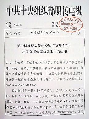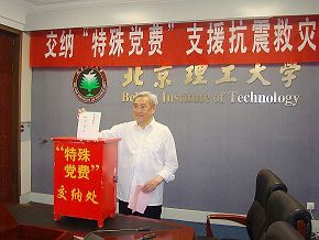 四川大地震牵动着千万党员的心。2008年5月21日,中组部发了组电明字[2008]24号特急明传电报《关于做好部分党员交纳“特殊党费”用于支援抗震救灾工作的通知》。我校党员同志纷纷自愿交纳“特殊党费”,不少同志都在千元以上。从今天早晨至截止发稿时,共有84名党员,交纳“特殊党费”53550元,其中交纳千元及以上党费的有48人。这其中既有教师党员、博士生党员和校处党员领导干部,特别值得一提是,我校离退休干部党委的41名老党员、老干部,交纳“特殊党费”合计12850.00元,其中魏丽媛、王鹏越、傅堃、匡吉、张才君五位同志,各交纳了1000.00元。