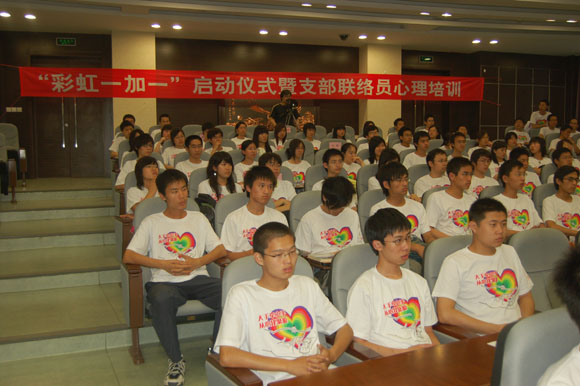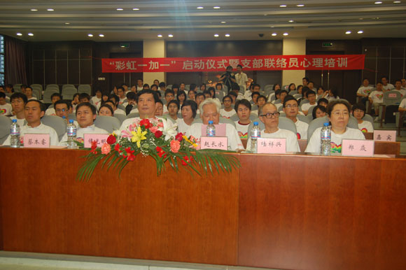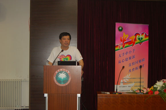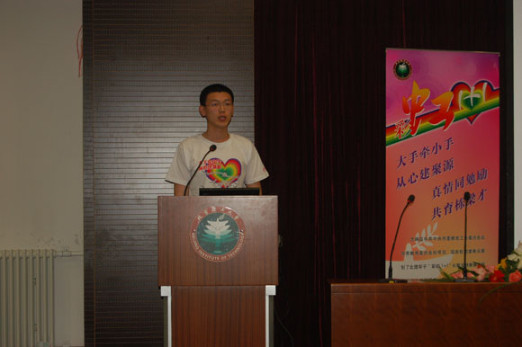 随后,宇航学院06级学生朱龙涛代表所有“彩虹一加一”心理联络员发言,他讲到:“我们将通过多种方式同聚源中学的同学进行交流,对大学生活有更多的认识,对人生有更好的规划,更加乐观地面对未来的人生。今天的活动是北理学子今后长期对灾区同学承诺的开端。我们会通过多种形式与灾区的同学展开长久的共建的活动。今天我们在此参加心理培训,就是为了能更好地给予灾区同学温暖,更顺利地帮助他们走出困境;同时,我们也是为了更大程度地学习到他们身上那种面对灾难依然保持乐观、坚强、勇敢的品质。”