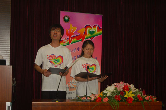 活动开始后,信息学院 07级黄志鹏、车辆学院07级刘卉园满怀深情的朗诵了我校良乡校区彩虹志愿者原创诗歌《雨后彩虹》。