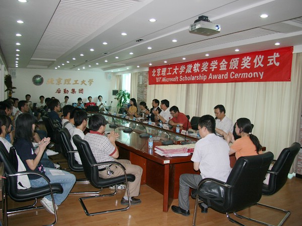 北京理工大学首届微软奖学金颁奖仪式于6月11日在北京理工大学后勤楼208会议室隆重举行。与会的嘉宾、领导有微软(中国)有限公司教育行业总经理陈伟先生、微软公司吴青女士、北京理工大学党委副书记侯光明教授、北京理工大学软件学院常务副院长丁刚毅教授、北京理工大学软件学院副院长陈朔鹰老师。颁奖大会由北京理工大学软件学院副书记、副院长陈旵明老师主持。