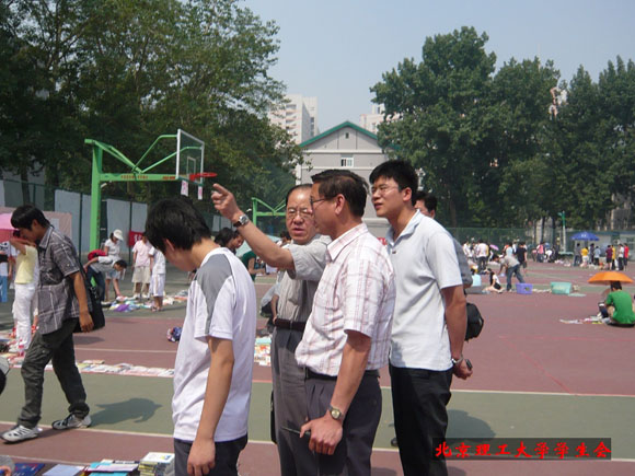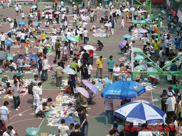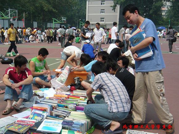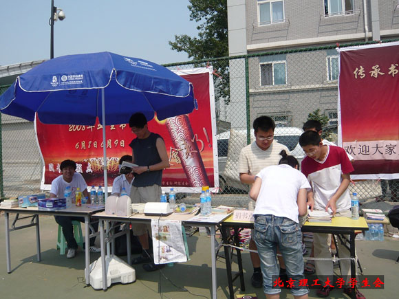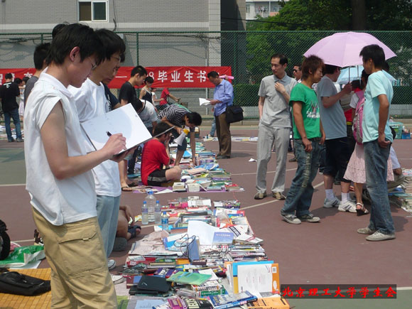 6月8日至9日,校团委、保卫处、学生会和研究生会在西篮球场共同举办了主题为“传承书海智慧,奔向锦绣前程”的北京理工大学2008年毕业生书市暨“点燃爱心火炬,传递北理精神——向四川聚源中学捐赠课外图书”活动。毕业生书市是我校的一项传统学生活动,是同学们厉行节约、营造和谐校园文化氛围,传递学习资料、交流学习经验、增进感情交流的平台,多年来深受同学们喜爱。