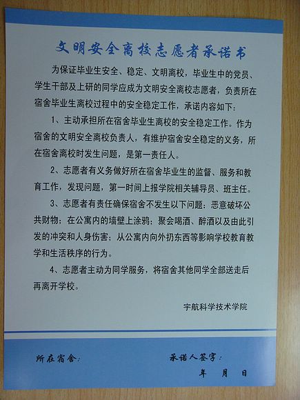 与会同学在感受学院温暖的同时,也纷纷表示自己会尽职尽责,完成文明离校、安全离校的相关工作,保证学院每一位毕业生高兴、平安地离开学校。最后,与会的同学在学院《文明安全离校志愿者承诺书》上郑重签下自己的名字。