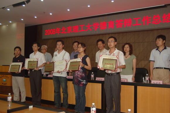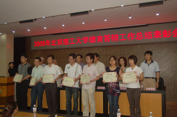 为鼓励各学院结合本学院特色,创造性的开展德育答辩工作,增进德育答辩工作实效,切实达到以评促建的目的,我校出台了《德育答辩工作优秀组织奖评比标准(试行)》,对在德育答辩工作中表现突出的单位和个人进行表彰。今年依据此标准,经过由学生工作部、组织部、宣传部、党校等部门组成的评审小组的认真评审,共评出优秀组织奖(集体奖)5个,优秀组织奖(个人奖)17个。在总结表彰会上,学校党委副书记侯光明宣布了《关于2008年北京理工大学德育答辩工作优秀组织集体奖、优秀组织个人奖的表彰决定》,生命科学与技术学院、人文社会科学学院、设计艺术学院、软件计算机科学技术学院、信息科学技术学院分别获得优秀组织集体奖;郝群、贾利军、王征、贾效明、周潇潇等17名教师荣获优秀组织个人奖,受到了表彰奖励。