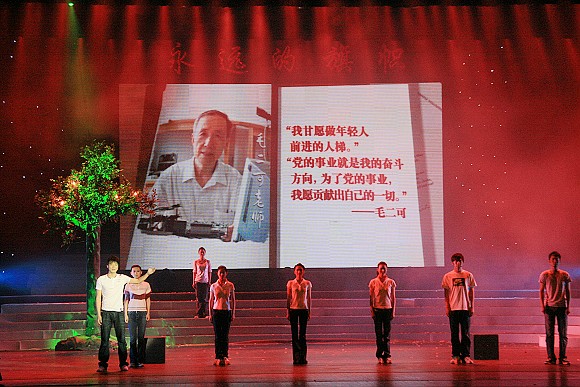 《激励》篇展现了不同时期共产党员冲锋在前、迎难而上,发挥先锋模范作用的风采,特别表现了北京高校师生党员积极参与抗震救灾的感人事迹。当以我校毛二可老师为代表的党员先进事迹通过大屏幕向现场展示的时候,引起观众的强烈共鸣,并报以热烈掌声。