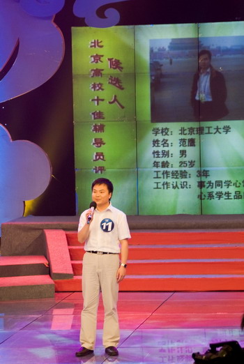 在从各高校的推荐人选基础上,共有来自清华大学、北京大学、中国人民大学、北京师范大学、北京航空航天大学和我校等推荐的35名候选人入围初赛名单。在通过网络投票、报刊投票和专家投票三种方式评选以后,从35名候选人中,评选出了来自清华大学、中国人民大学、北京师范大学、北京航空航天大学和我校等15名候选人进入最后的决赛。6月26日,在北京电视台,通过现场竞技的方式,展示辅导员的基本功和个人风采,由现场领导、老师和同学组成评委,评选出10名辅导员入围“北京高校十佳辅导员”。