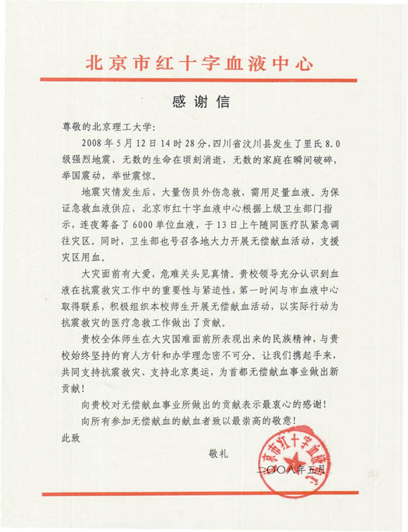 同时,北京市红十字血液中心还向我校发来了感谢信。随着救灾工作的进一步展开,团委将根据灾区医疗部门需要,从2000余名献血志愿者中选拔身体素质较好的同学分阶段有步骤的参加献血,并为献血学生做好各项服务工作。