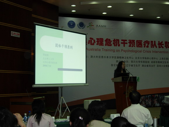 7月10-13日,贾晓明教授受邀参加中澳心理危机干预医疗队队长和志愿者骨干培训班作为中方讲员参与培训讲授和小组督导工作。此培训班由澳大利亚政府资助,由澳大利亚墨尔本大学亚澳精神卫生中心、北京大学临床心理中心等国内机构联合主办。共有来自全国各地主要是四川当地的200多名医务工作者和60多名在灾区工作的志愿者参加。培训者有来自澳大利亚的专家,也有国内国务院专家应急办主任等各方面专家,从宏观管理、政策制定,到团队建设、微观心理干预技术,对培训学员进行了全方位的培训,特别是小组督导,为直接在灾区工作的心理工作者进行了个案督导,使学员收获很大,培训非常成功。