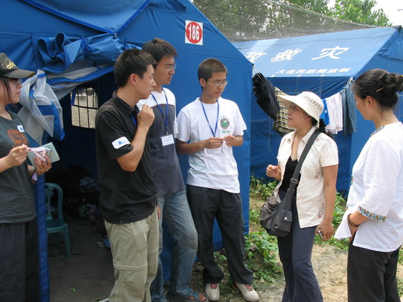 贾晓明教授在川期间,于7月9日去重灾区北川县的擂鼓镇安置点、安县永安镇安置点看望已在那里工作十几天的社会工作专业学生。社会工作专业学生秦超、崔官哲、吴小静、张亚楠四位同学参与了中国社会工作协会儿童救助工作委员会的援助工作,于2008年6月23日赴四川,进驻灾区群众安置点,建立社会工作站,开展援助工作。