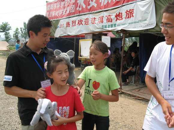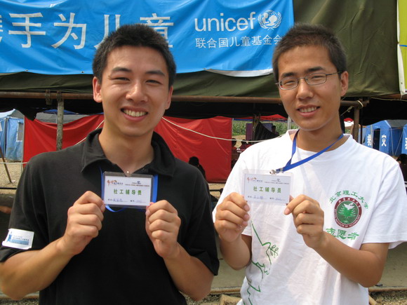 擂鼓镇是一个距受灾最重的北川县城最近(直线距离只有500米)的一万多人的安置点,秦超同学在那里建立了第一个社工站,并担任站长,开展了非常行之有效的援助工作。崔官哲是永安镇安置点的社工站站长,吴小静和张亚楠和他一起工作。永安镇安置点也主要接收的也是北川的灾区群众。他们运用社会工作专业的态度、理念和方法,挨个帐篷走访安置点的灾区群众,了解他们的需要,特别是儿童的需要,倾听他们的心声,收集单亲家庭和孤儿的信息,协助儿童救助工作委员会为他们提供紧缺的物资和助学、助医、助养等服务。