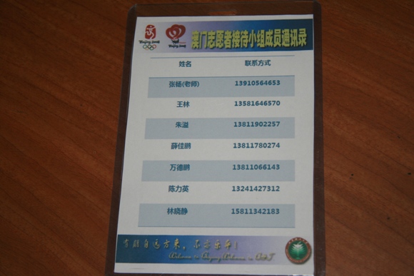 接待小组的同学以1对4的责任网的方式,对澳门志愿者在京服务的20天内,进行生活上的服务。对于志愿者在京期间遇到的困难和问题,都予以全力的帮助,并且尽最大的努力保证志愿者们的安全。相信在2008年的这个夏天,这些共同为北京奥运会做出贡献的同学们,都会在生命中留下最为珍贵的回忆.
