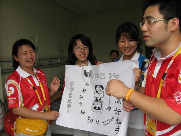 志愿者们没有一刻忘记过善良可亲的小莹,听到她住院治疗的消息,大家对她的病情都十分担心。衡老师、沙老师一行代表场馆和志愿者们立即前往海淀医院看望她,为她带去志愿者大家庭的问候,同时还带去了为她精心准备了新鲜水果和牛奶,她的好朋友志愿者李珍与苗娟以及运行支持小组专门为她画的极其可爱的漫画,这一切都令小莹十分感动。志愿者经理沙老师也给小莹带来了惊喜------一条新版的志愿者微笑圈,这些礼物代表了我们所有志愿者的问候,祝愿小莹早日康复,尽快回到我们这个大家庭。