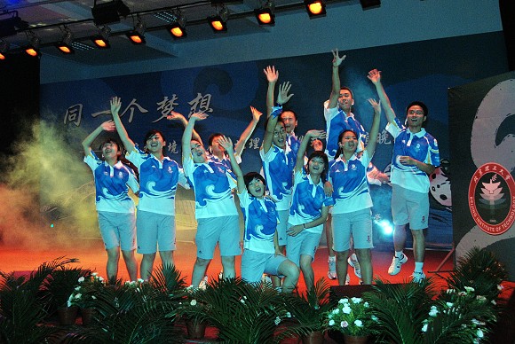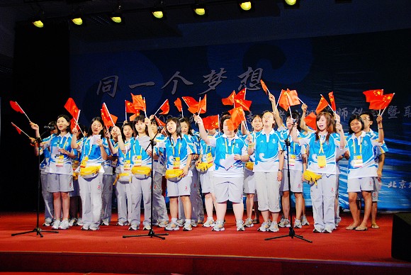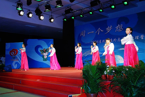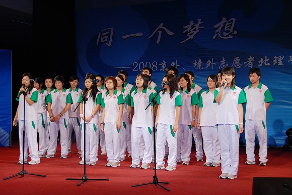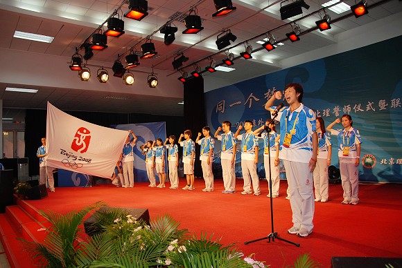 2008年8月6日晚7点,北京理工大学在新食堂四层多功能厅举办“同一个梦想——京外、境外志愿者誓师仪式暨联谊晚会”。来自港澳台侨的近120余名志愿者、来自江苏与吉林的160余名志愿者和北京理工大学的志愿者共计400余名观看参与了本次联谊晚会。