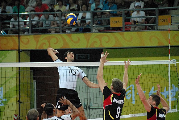 在北京理工大学体育馆率先进行的一场比赛中,意大利男排(蓝队)一扫上场1-3负于美国队的颓势,在今天的比赛中,以3-0轻松战胜委内瑞拉队(白队),三局详细比分分别为:25-21,25-20和25-21。