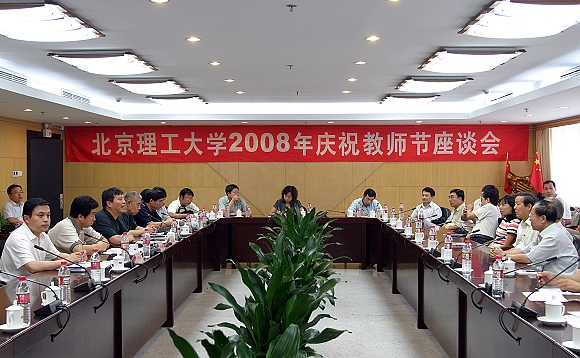 9月10日下午,国际教育交流中心第一会议室内,节日气息浓厚,我校2008年庆祝教师节座谈会在这里举行。校领导郭大成书记、胡海岩校长、侯光明副书记与教学科研一线教师代表、“师德标兵”代表、“抗震救灾”教师代表、科技奥运项目负责教师代表、奥运运行团队代表、新入校青年教师代表、管理人员代表和老教师、离休干部代表及学生代表等40余人,欢聚一堂,同诉教育心声,畅谈发展大计,共庆自己的节日——第24个教师节。座谈会由侯光明副书记主持。