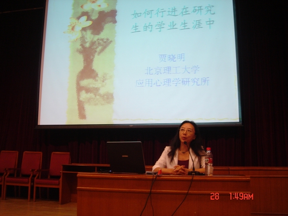 讲座由北京理工大学人文社会科学学院社会工作与心理学系贾晓明教授主讲,她就主题“如何行进在研究生的学业生涯中”进行了生动的心理分析和科学的引导,博得了在场每位新生的热烈掌声。
