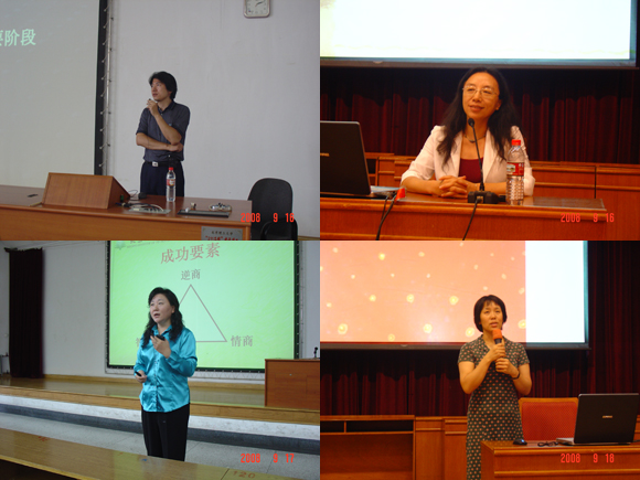 从9月16日至18日,研究生心理大讲堂共举办7场培训,聘请清华大学刘丹博士,首都医科大学林涛博士,北京理工大学贾晓明教授、李林英教授作讲座,在各学院的组织下,全校共有2323人参加了心理大讲堂的培训,占2008级新入学研究生的77%。