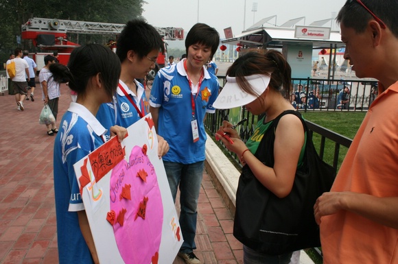 在整个服务期间,生命学院的城市志愿者们不仅认真做好“信息咨询、应急服务、语言翻译”三项基本服务要求,还根据生命学院和五棵松体育馆的特点,成功组织和开展了各种特色活动。“我心中的奥运活动”吸引了许多小朋友前来绘制他们心目中的奥运会,以表达他们憧憬奥运,渴望世界和平的愿望。活动中,小朋友们绘制的美丽作品,吸引了不少游客和观众。八一建军节,生命学院的城市志愿者们发起的“为奥运献墨宝,为祖国寄真情”活动吸引了多数书法爱好者和退休老红军前来献字,为奥运献上祝福,活动得到市民极好的赞扬。七夕情人节,在这天生命学院的城市志愿者给沉浸在节日甜蜜中的情侣们一个向即将举行的北京奥运会一个表达自己情感的机会,一块情人节奥运留言板写满了祝福也记满了爱情。丰富的活动,精彩的内容,是生命学院城市志愿者给北京奥运会的一份贡献。