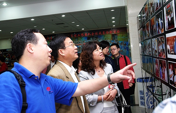 党和国家领导人来我校体育馆视察的图片吸引了不少参观者的注意力。
