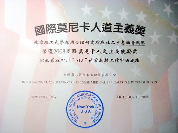 10月12日,四川“5.12”地震后心理援助首届国际论坛在四川绵阳举行。此次会议由国际华人医学家心理学家联合会(IACMSP)、四川省精神卫生中心、《中国健康心理学杂志》主办。在论坛上,国际华人医学家心理学家联合会特别为我校人文社会学院的应用心理学研究所与社会工作系志愿者团队颁发了国际莫妮卡人道主义奖,以鼓励北京理工大学在“5.12”抗震救灾心理援助中做出的突出贡献。