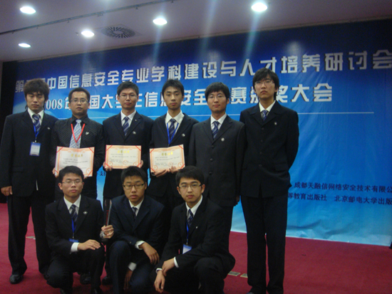 “2008年全国大学生信息安全竞赛”由教育部高等学校信息安全类专业教学指导委员会主办,大赛评审专家组组长为教指委主任委员沈昌祥院士。大赛历时5个月,参加本次比赛的共有来自全国54个高校的258支队伍。通过初赛、复赛的筛选,最终只有73支竞赛队进入决赛,决赛于2008年10月22日至10月25日在成都电子科技大学拉开战幕,来自全国各大高校的73支代表队、200余名队员上演一场智慧与创造力的较量。大赛决出了一等奖10名,二等奖15名。