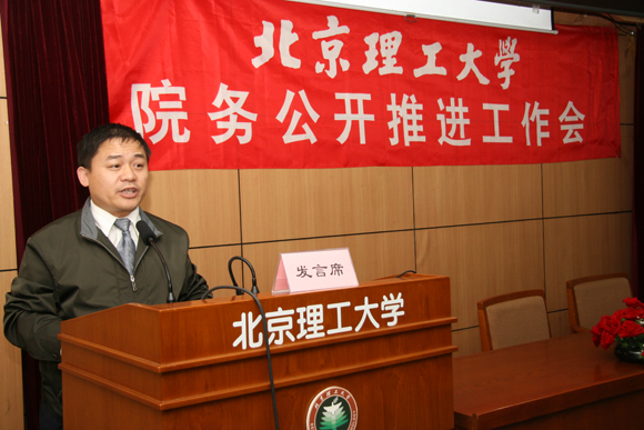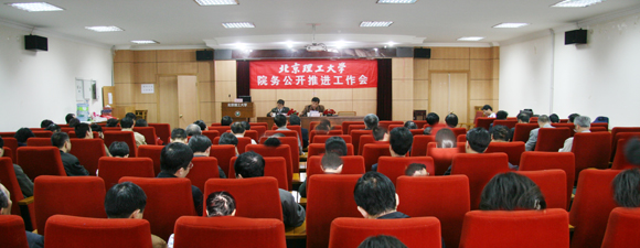 2008年10月20日下午,由纪委、校工会组织召开的北京理工大学院务公开推进工作会议在逸夫楼二层报告厅举行。校党委副书记、工会主席侯光明,副校长赵显利,纪检委副书记李燕月出席大会并发表了重要讲话。学校办、组织部、宣传部、人事处、纪委、监察室、财务处、国资处负责人,各学院负责人,校教代会常设主席团成员、校工会委员会委员、二级教代会、工会主席、副主席,教代会代表团团长、副团长,提案处理工作委员会委员、民主评议领导干部工作委员会委员及教师代表等近百人参加了会议。大会由校工会常务副主席蔡本睿主持。