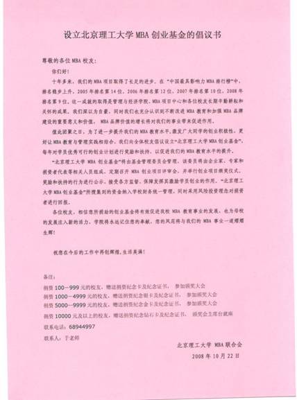 10月25日,管理与经济学院举行了“2008北京理工大学MBA校友返校日暨专业硕士学位授予仪式”。在此次活动中,管理与经济学院接待了近百名校友,并发起成立创业发展中心的倡议。
