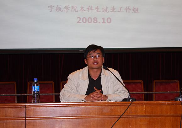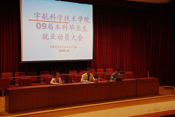 2008年10月30日下午,宇航科学技术学院09届毕业生就业动员大会在中心教学楼报告厅召开。学院主管学生工作副书记 副院长董兆波老师、学校招生就业处宋宇翔老师、学院本科生就业办公室方蕾老师以及09届毕业生辅导员张媛媛老师出席了本次会议。09届毕业生全体同学参加了本次大会。大会由学院副书记 副院长董兆波主持。