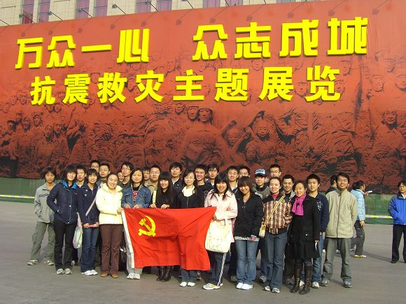 为了弘扬民族精神,感悟全国人民团结一心抗震救灾的伟大壮举,理学院本科生06级数学党支部和物化力党支部于2008年11月16日来到北京军事博物馆参观“万众一心,众志成城”抗震救灾主题展览。