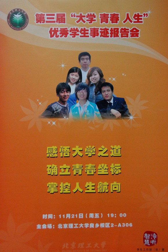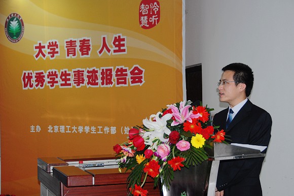 从2007年开始,学校专门为“大学 青春 人生”报告团成员设立了北京理工大学“领航奖学金”,奖励金额2000元,以加大对优秀学生宣传表彰的力度,更好的营造优良学风校风。颁奖仪式结束后,六名报告团成员分别针对考研、就业、竞赛、班级工作等学生感兴趣的方面结合自身情况做了精彩的报告。