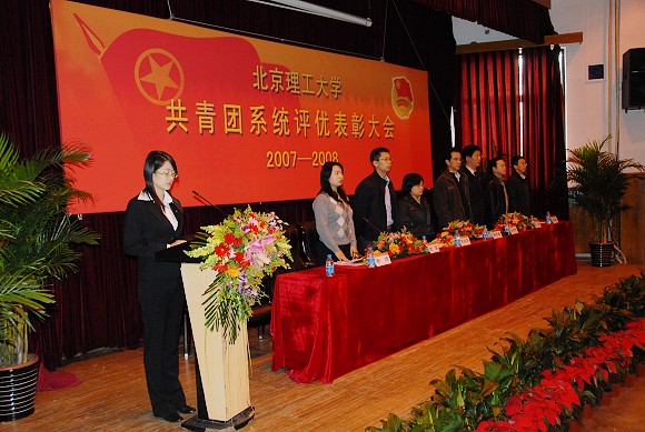 会上,校团委书记徐强宣读了我校共青团系统2007-2008年度评优表彰决定。校团委副书记衡靖代表校团委做了本年度评优工作总结。“分团委特色活动”奖获奖单位代表生命科学与技术学院分团委书记王征,“奥运招募培训先进单位”获奖代表设计艺术学院分团委书记周明宇,“十佳团支部”获奖支部代表管理与经济学院08410502团支部吕景舜,“十佳团员”获奖同学代表设计艺术学院栾中群分别就各自所获奖项作了获奖感言。