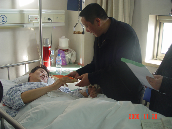 2008年11月10日下午,物业中心绿化部务工人员许七四同志在中心花园进行树木入冬前的正常养护作业——清理干树枝时,不慎从树上坠落。经医生诊断为:T10椎体压缩性骨折脱位半截瘫。更为让人揪心的是,他在河北的老家中尚有12岁的幼女和86岁的老母亲,对于永久性失去劳动能力的许七四来说,生活一下子陷入了困境。