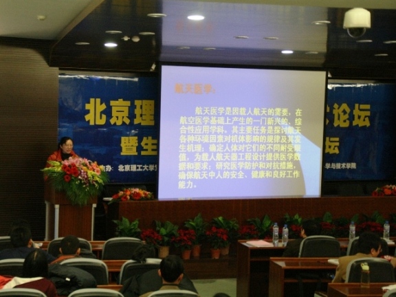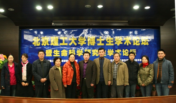 2008年12月19日,由党委研究生工作部主办,生命科学与技术学院承办的2008年北京理工大学博士生学术论坛生命科学分论坛举行开坛仪式。出席仪式的领导和嘉宾有中国航天员训练中心医监医保研究室主任李勇枝教授、北京理工大学党委研究生工作部部长肖文英老师、校保卫处长李汉军老师,生命学院院长邓玉林教授,院党委书记李兰东老师,副院长唐晓英老师,副院长、副书记周连景老师,另北京大学医学部、北京师范大学和北京科技大学生命科学专业研究生会负责人也应邀出席了本次论坛开幕仪式。我院各系所中心及学科特区负责人和教师代表,研究生同学也积极参加了本次活动。