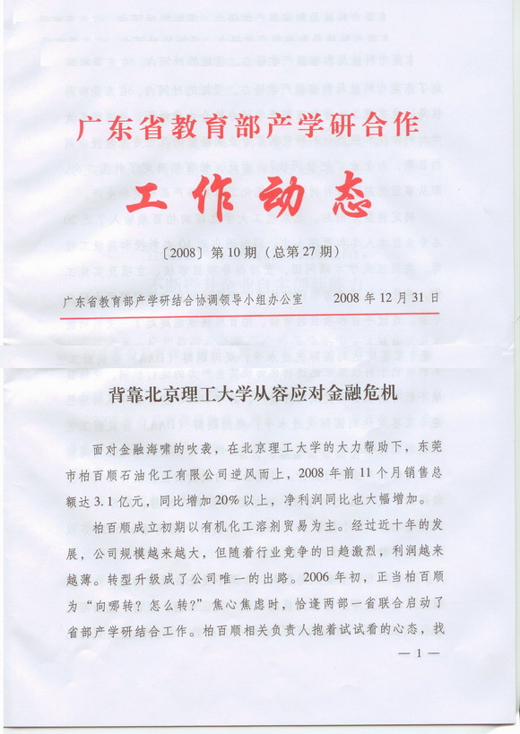 面对金融海啸的吹袭,在北京理工大学的大力帮助下,东莞市柏百顺石油化工有限公司逆风而上,2008年前11个月销售总额达3.1亿元,同比增加20%以上,净利润同比也大幅增加。