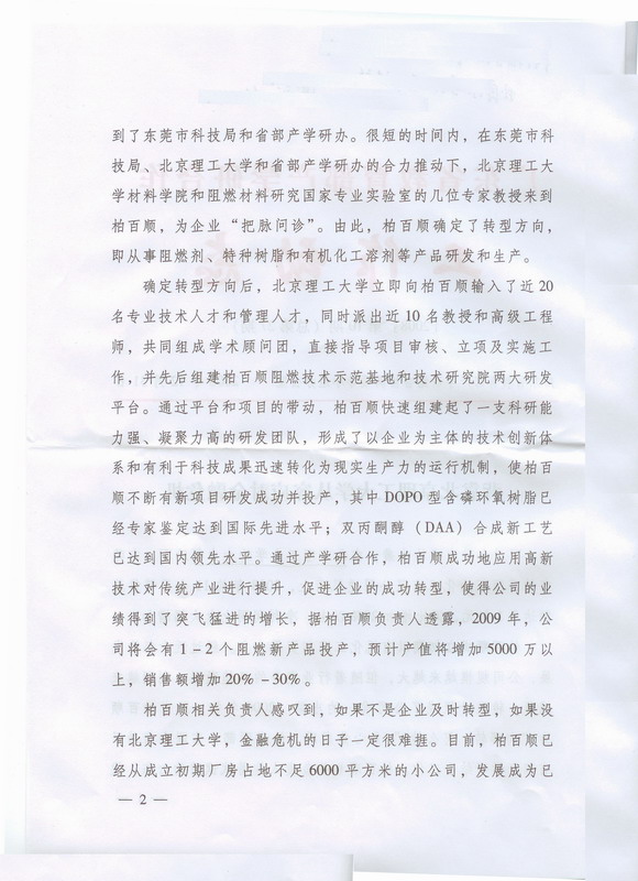 柏百顺成立初期以有机化工溶剂贸易为主。经过近十年的发展,公司规模越来越大,但随着行业竞争的日趋激烈,利润越来越薄。转型升级成了公司唯一的出路。2006年初,正当柏百顺为“向哪转?怎么转?”焦心焦虑时,恰逢两部一省联合启动了省部产学研结合工作。柏百顺相关负责人抱着试试看的心态,找到了东莞市科技局和省部产学研办。很短的时间内,在东莞市科技局、北京理工大学和省部产学研办的合力推动下,北京理工大学材料学院和阻燃材料研究国家专业实验室的几位专家教授来到柏百顺,为企业“把脉问诊”。由此,柏百顺确定了转型方向,即从事阻燃剂、特种树脂和有机化工溶剂等产品研发和生产。