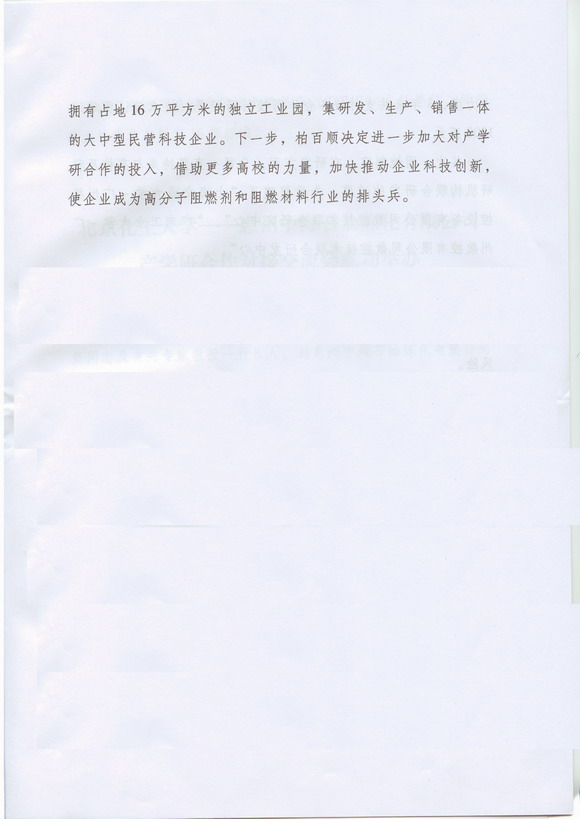 柏百顺相关负责人感叹到,如果不是企业及时转型,如果没有北京理工大学,金融危机的日子一定很难捱。目前,柏百顺已经从成立初期厂房占地不足6000平方米的小公司,发展成为已拥有占地16万平方米的独立工业园,集研发、生产、销售一体的大中型民营科技企业。下一步,柏百顺决定进一步加大对产学研合作的投入,借助更多高校的力量,加快推动企业科技创新,使企业成为高分子阻燃剂和阻燃材料行业的排头兵。