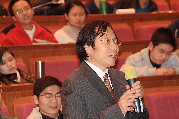 田院士介绍,1904年,法国数学家庞加莱在一篇论文中提出了一个看似很简单的拓扑学的猜想:在一个三维空间中,假如每一条封闭的曲线都能收缩到一点,那么这个空间一定是一个三维的圆球。但1905年发现提法中有错误,并对之进行了修改,被推广为:“任何与n维球面同伦的n维封闭流形必定同胚于n维球面。”后来,这个猜想被推广至三维以上空间,被称为“高维庞加莱猜想”。在解释庞加莱猜想如何从低维扩展到高维的过程,田院士举出一个形象的例子:“在大学一年级我们学习微积分时,低维中求微积分的方法是唯一的,但到高维的情况下呢?譬如有一个光滑的球面,我们可以沿着多个方向求积分,那么求解的方法就非常多了,这时微分的结构发生了变化。”同样的,在解决庞加莱猜想时,由于我们生活在三维空间中,所以无法直接对一个三维球体一览无遗,但是,我们可以通过二维情况下的球体来进行类比。田院士向在座师生介绍了现今研究庞加莱猜想的两种主要方法:Ricci流与拓扑方法,并分析了两种方法的优劣。田院士的精彩演说不时博得阵阵掌声。