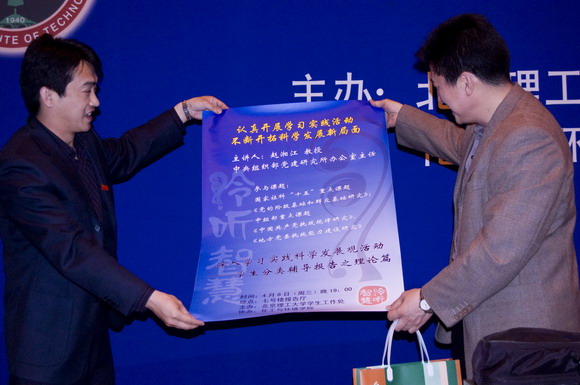 报告结束后学生工作部副部长杨海代表学校把一些具有学校特色的纪念品和此次报告会的海报赠予赵湘江教授,同时感谢赵湘江教授为我校学生党员开展学习实践活动提供了丰富的理论知识。