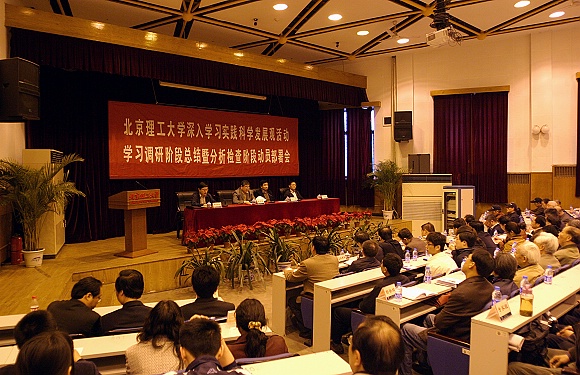 焦文俊组长在讲话中对学校学习调研阶段各项工作的扎实开展给予了充分肯定。他指出,自3月17日下午学校召开动员大会以来,在部属高校学习实践活动领导小组的领导下,在工信部党组的关心和指导下,北理工党委对深入学习实践科学发展观活动高度重视,精心组织,广大党员、干部积极参与,各项活动扎实顺利推进,总体形势良好,取得了重要阶段性成果。他指出,我校学习实践科学发展观活动有5个特点:一是理论学习形式多样、重点突出;二是调研全面深入、集思广义;三是解放思想讨论围绕载体、主题鲜明;四是督导机制落实到位,积极发挥作用;五是统筹兼顾,搞好结合,体现了“两手抓、两不误、两促进”。他要求我校要精心组织召开好校院(处)两级领导班子专题民主生活会,要形成高质量的领导班子分析检查报告。学校要按照中央要求和部属高校学习实践科学发展观活动领导小组的工作部署,高标准高质量地完成分析检查阶段的各项工作,确保取得实实在在的成效,为实现“党员干部受教育、科学发展上水平、人民群众得实惠”的总体要求打下坚实基础。