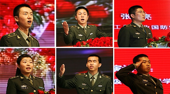 接着,六名优秀的北京理工大学国防生同学围绕“当代革命军人核心价值观”主题,开始了激情澎湃的演讲。这六位国防生中,两名是大一学生,两名大三学生,一名在读博士生,还有作为北京理工大学07届国防生毕业的、即将参加建国60周年庆典阅兵式方阵的一名基层青年军官。他们充满感情地讲述了自己从身为国防生那刻起,所深深感受到的责任和使命;表达了作为一名未来的革命战士,要坚定信念跟党走,永远忠诚于党的决心;他们动情地回顾了解放前红军、八路军战士热爱人民的高尚精神和08年四川震灾中救灾部队的感人表现;详述了通过学校开展的“当代革命军人核心价值观”主题教育活动,自己思想上得到的巨大升华。他们向在场所有国防生发出倡议:作为新时代国防生,要认真领会五四青年节胡锦涛主席在中国农大的谈话精神,努力学习,把爱国精神落实到日常学习和生活中去,从帮助、关怀身边人做起,以一名革命战士的标准严格要求自己,为祖国和人民的利益奉献自己的一切。
