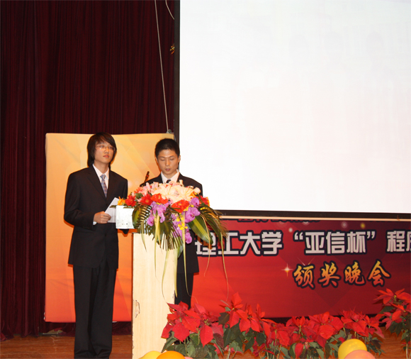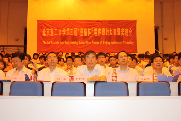 2009年5月24日晚,北京理工大学第三届“亚信杯”程序设计大赛颁奖晚会在中关村校区七号楼报告厅成功举办。出席本次晚会的领导和嘉宾有:北京理工大学李和章副校长,亚信科技(中国)有限公司副总裁张寅虎先生、亚信科技(中国)有限公司副总裁刘丰先生,亚信科技(中国)有限公司人事资源部季青老师,北京理工大学教务处仲顺安处长、林海副处长,基础教育学院杨刚副院长,软件学院分党委李波书记,软件学院闫达远副院长,软件学院陈旵明副书记、副院长,北京理工大学ACM竞赛队教练林永钢老师。晚会由软件学院本科2008级的刘明德、董佳琦、潘晓梦、杨海瑞主持。