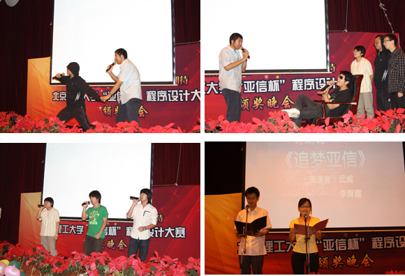 在颁奖晚会上穿插着由软件学院学生自主编导的节目,有:软件学院07级同学武威和李青霞带来的声情并茂的原创朗诵《追梦亚信》,表现了同学们比赛的艰辛历程与收获;本科2008级的同学们带来的一个娱乐与教育意义兼备的小品《我要AC》,深刻地反映了同学们学习程序设计的苦与乐;由2007级于宇、屠楚楠和2008级胡晓炜带来的合唱《奔跑》。
