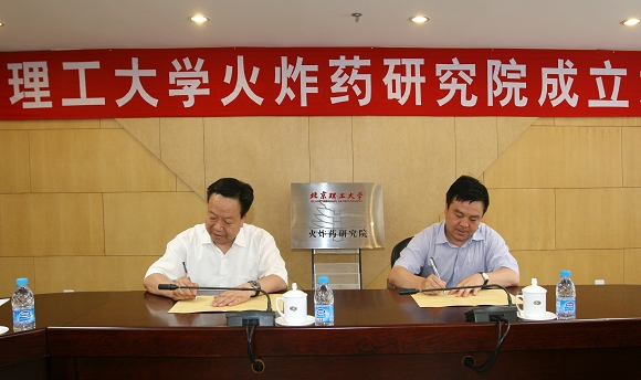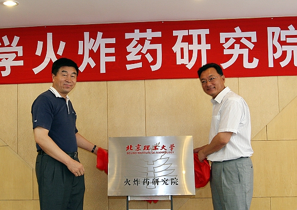 兵器工业集团第三事业部主任王成国与北京理工大学党委书记郭大成为北京理工大学火炸药研究院揭牌。