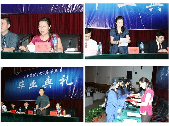 生命学院2009年毕业典礼在隆重的国歌声中拉开序幕,周连景副书记、副院长首先介绍了与会领导,并对参加本次毕业典礼的全体毕业生表示祝贺,对与会的教师代表和家长们表示了诚挚的感谢。大会首先有生命学院主管本科生教学的李勤副院长宣读本科毕业生名单(左上图),由主管研究生教学唐晓英副院长宣读研究生毕业生名单(右上图),学院党委李汉军书记宣读了优秀毕业生名单(左下图)。随后,优秀毕业生代表上台,学院领导向他们颁发了荣誉证书(右下图)。