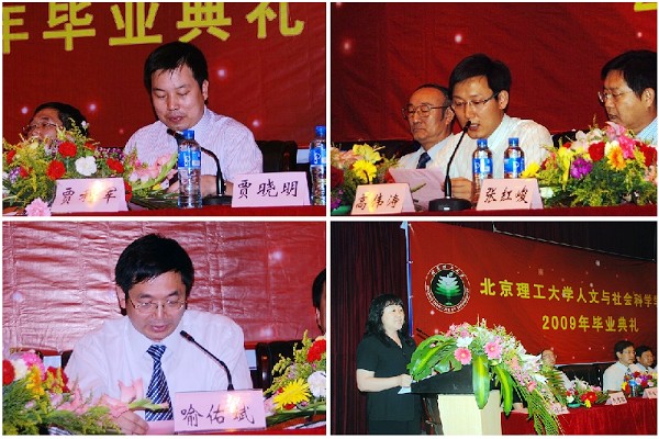 副院长贾利军老师(左上)宣读了2009届毕业生名单及学位授予情况;党委副书记、副院长高伟涛老师(右上)宣读了2009届优秀毕业生、优秀毕业研究生名单;副院长喻佑斌老师(左下)宣读了2009年德育答辩毕业生优秀论文名单;教师代表李林英老师(右下)向所有毕业生送上美好的祝愿。