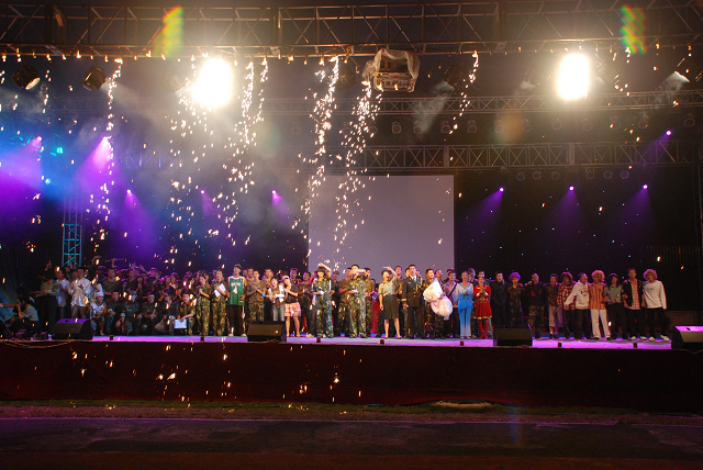 同学们的笑声、欢呼声与炫目的舞台灯光和手中挥舞的荧光棒交织在一起,共同构成一片欢乐的海洋。在这欢乐的气氛中,《歌唱祖国》的乐曲响起,所有演员和观众同唱一首歌,09级军训文艺汇演圆满落幕!